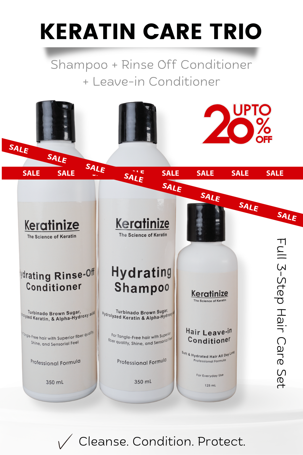 This trio includes a deeply hydrating shampoo, rinse-off conditioner, and a creamy leave-in treatment—each designed to strengthen hair, reduce breakage, and restore softness and shine. Infused with hydrolyzed keratin, honey extract, and nourishing oils, it helps lock in moisture, smooth the cuticle, and improve manageability without heaviness. Ideal for daily use on chemically treated or moisture-depleted hair.